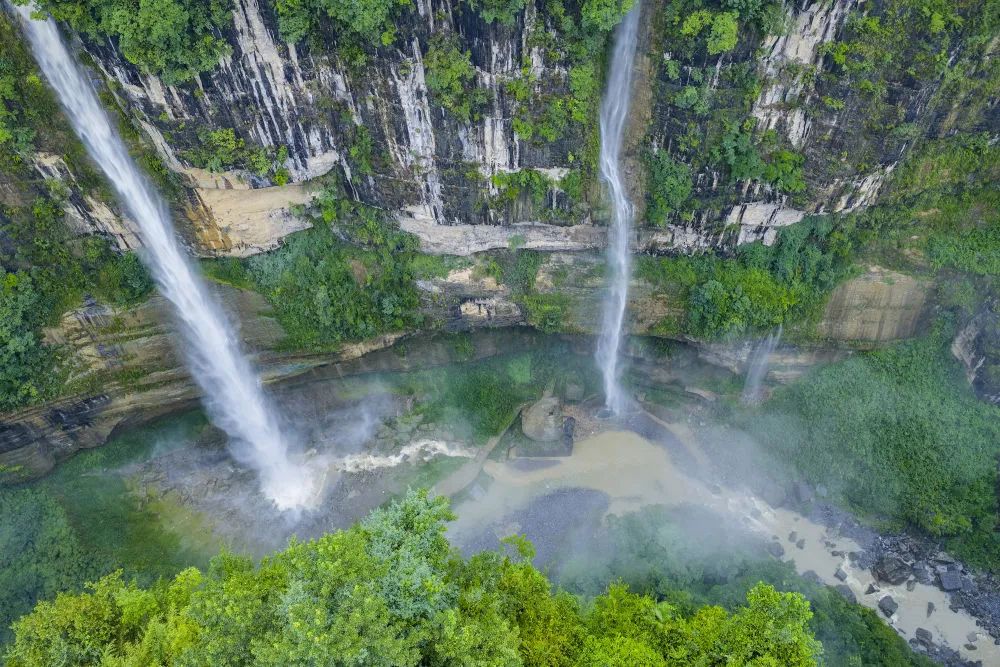 2025年8月11日拍攝的恩施大峽谷雨后瀑布景觀。(無人機照片)CICPHOTO/杜維 攝