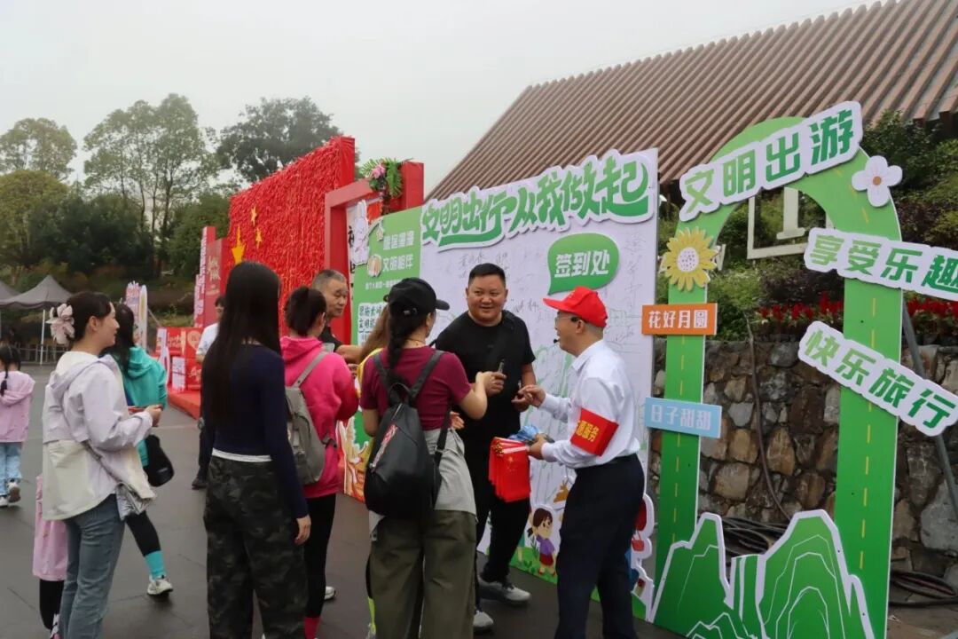 與此同時(shí),各志愿服務(wù)點(diǎn)同步推進(jìn)文明旅游宣傳,通過發(fā)放宣傳資料與趣味知識問答相結(jié)合的方式,將文明旅游規(guī)范轉(zhuǎn)化為“答對有禮”的互動體驗(yàn),催生了“文明打卡”的新風(fēng)尚。當(dāng)日共計(jì)發(fā)放文明旅游宣傳手冊530余份,吸引了320余名游客積極參與。