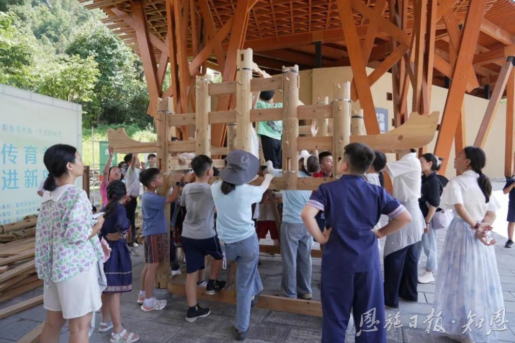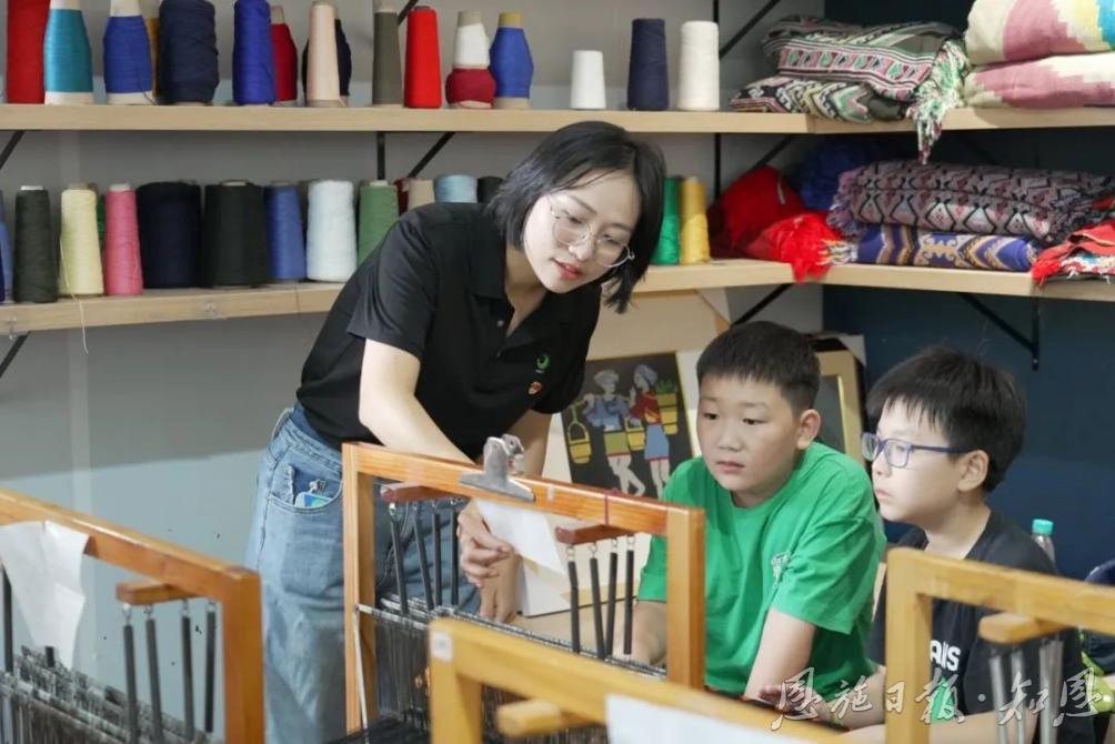 行程尾聲,文化探索愈發(fā)深刻。在西蘭卡普基地,土家織錦的絢爛色彩瞬間吸引了孩子們的目光。聽完非遺文化知識后,他們親手操作傳統(tǒng)織機,嘗試將斑斕絲線編織成獨屬自己的圖案。